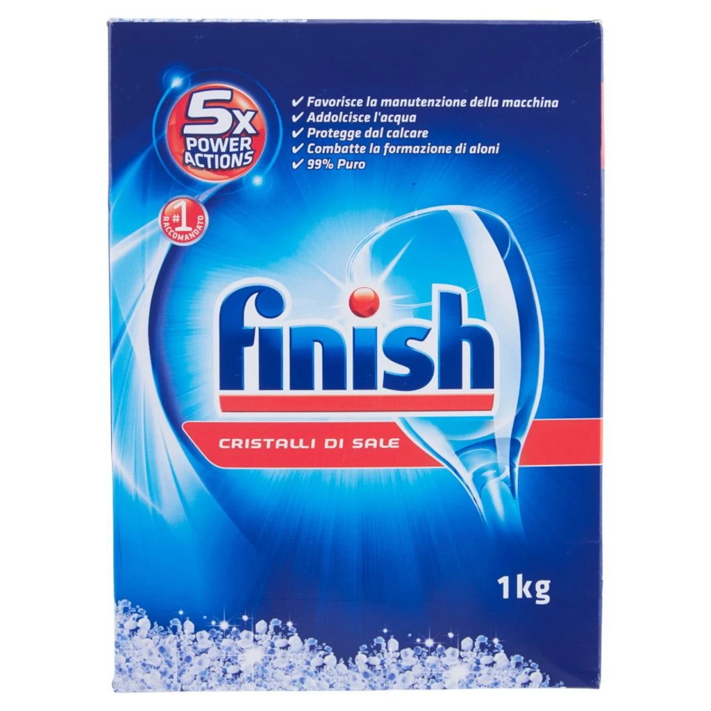 Finish cristalli di sale da 1 kg. Addolcisce l’acqua, protegge dal calcare, aiuta a prevenire la formazione di aloni.